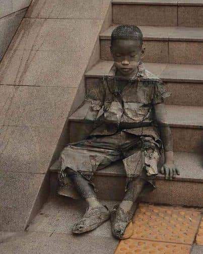 ஓவியத்தில் ஏழைச்சிறுவன் படிகளில் உட்கார்ந்திருக்கிறான்; அவன் மீதே பலர் வேகமாக நடக்கிறார்கள் ; கடந்து போகிறார்கள்.