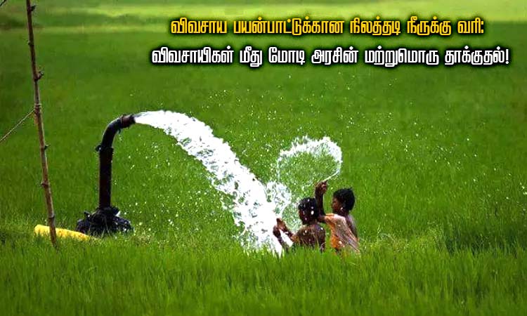 தற்போது விவசாயிகள் விவசாயத்துக்குப் பயன்படுத்தும் நிலத்தடி நீருக்கு வரி விதிக்கத் திட்டமிட்டுள்ளது. மாநில அரசுகளுடன் இணைந்து நடத்த உள்ள இந்த திட்டத்திற்கு மோடி அரசு ரூ.1600 கோடி ஒதுக்கியுள்ளதாகவும், சோதனை ஓட்டமாக பல்வேறு மாநிலங்களில் 22 இடங்களில் இத்திட்டம் செயல்படுத்தப்பட உள்ளதாகவும் செய்திகள் தெரிவிக்கின்றன.
