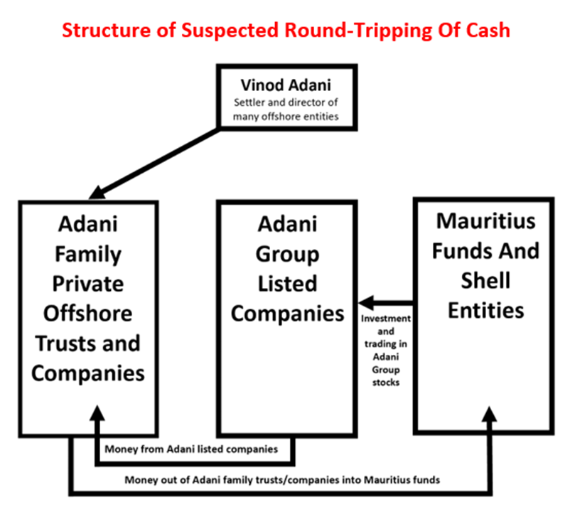வினோத் மற்றும் அவரது கூட்டாளிகள் செய்த சந்தேகபூர்வமான பரிவர்த்தனைகள் குறித்து தங்கள் ஆய்வில் நிரூபிக்கப்பட்டு இருப்பதாக ஹிண்டன்பர்க் கூறியுள்ளது. அவை பெரும்பாலும் அதானி குழும நிறுவனங்களுக்கு உள்ளே வந்துள்ளதை அல்லது இங்கிருந்து வெளியே சென்றுள்ளதையே காட்டுகின்றன. இந்த ஷெல் நிறுவனங்கள் எத்தகைய வர்த்தகத்திலும் ஈடுபடுவதில்லை. ஆனால் பல கோடி டாலர்களை இந்திய பங்குச்சந்தையில் பட்டியலிடப்பட்ட அதானி குழும நிறுவனங்களுக்கு மாற்றியுள்ளன. இந்தப் பண பரிவர்த்தனைகளில் பெரும்பாலும் வெளிப்படைத்தன்மை என்பதே இருந்ததில்லை.