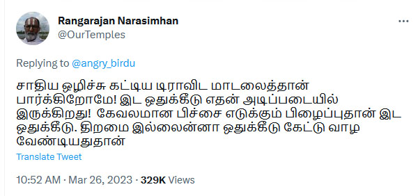 இதற்கு பதிலளித்த பார்ப்பன திமிர் பிடித்த ரங்கராஜன் நரசிம்மன் அம்பேத்கர் குறித்து இழிவாக பேசியதோடு, இட ஒதுக்கீடு குறித்தும் தனது விசத்தை கக்கியிருந்தார். “சாதிய ஒழிச்சுக் கட்டிய டிராவிட மாடலை தான் பார்த்தோமே! இட ஒதுக்கீடு எதன் அடிப்படையில் இருக்கிறது. கேவலமான பிச்சை எடுக்கும் பிழைப்பு தான் இடஒதுக்கீடு. திறமை இல்லைன்னா இடஒதுக்கீடு கேட்டு வாழ வேண்டியது தான்” என்று பதிவிட்டிருந்தார்.