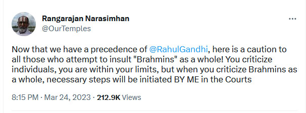 அப்படி நடந்த விசயம் தான் டிவிட்டர் சமூகவலைதளத்தில் நடந்தது . ரங்ககராஜன் நரசிம்மன் என்ற பார்ப்பனர் தனது டிவிட்டர் பக்கத்தில் “ராகுல்காந்தி மான நஷ்ட வழக்கு முன்னோடியாக இருப்பதால், ப்ராமணர்களை ஒட்டு மொத்தமாக விமர்சித்து அவமதிப்பவர்களுக்கு எச்சரிக்கை!. தனிமனிதனை விமர்சிப்பது அவரவர் விருப்பம். ஆனால் ஒட்டுமொத்த பிராமணர் சமூகத்தை விமர்சிப்போர் மீது நீதிமன்றத்தில் வழக்கு தொடர்வேன்” என்று பதிவிட்டிருந்தார்.