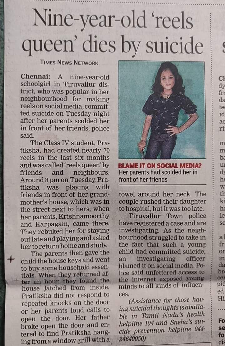 சமீபத்தில் ஒன்பது வயதே ஆன சிறுமி அவரது வீட்டில் தற்கொலை செய்து கொண்டு இறந்துள்ளார்