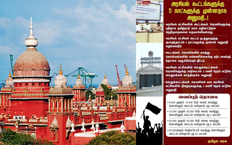 சமீபத்தில் கூட்டப்பட்ட அனைத்து கட்சி கூட்டத்தில் உயர் நீதிமன்ற உத்தரவின்படி, “கூடும் மக்கள் எண்ணிக்கையைப் பொறுத்து 1 லட்சம் முதல் 20 லட்சம் ரூபாய் வரை முன்வைப்புத் தொகை செலுத்த வேண்டும் என்பது உள்ளிட்ட நிபந்தனைகள் விதிக்கப்பட்டுள்ளன. மேலும், கூட்டங்களுக்கு 15 நாட்களுக்கு முன்பு அனுமதி கோர வேண்டும், கூட்டங்கள் 3 மணி நேரத்துக்குள் முடிக்க வேண்டும், பங்கேற்பாளர்களுக்கு குடிநீர், கழிப்பறை ஏற்பாடு செய்ய வேண்டும், மேடைக்கு பொறியாளர் சான்றிதழ் பெற வேண்டும் போன்ற விதிகளும் சேர்க்கப்பட்டுள்ளன” என்று திமுக முன் வைத்துள்ளது..