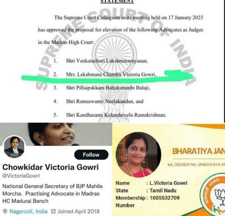 தற்போது நீதிபதி பதவிக்கு பரிந்துரைக்கப்பட்டுள்ள விக்டோரியா கௌரியும் அதே வகையை சேர்ந்தவரே! வழக்கறிஞராக இருப்பவர்கள் கட்சியில் இருக்கக் கூடாது என்பதில்லை. ஆனால் ரவுடிகளையும், பாலியல் குற்றவாளிகளையும், குண்டர்களையும், மதவெறியர்களையும் கொண்ட ஒரு பாசிச கட்சியில் உள்ளவர்கள் வழக்கறிஞர்களாகவும், நீதிபதிகளாகவும் இருந்தால் அவர்கள் யாருக்கு சாதகமாக செயல்படுவார்கள் என்பதை நாம் சொல்ல வேண்டியதில்லை.