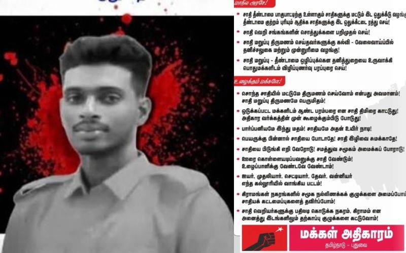 எதிர்வரும் செப்டம்பர் 17 தந்தை பெரியார் பிறந்த நாளில், “சாதி மறுப்பு திருமணம் செய்து கொண்ட இணையர்களுக்கு பாதுகாப்பு கொடு!”, “ஆணவப் படுகொலையை தடுக்க தனி சட்டம் இயற்று!” என்ற என்ற முழக்கங்களை முன்வைத்து மக்கள் அதிகாரம் அதன் தோழமை அமைப்புகளுடன் இணைந்து மதுரை மற்றும் கோவையில் கண்டன ஆர்ப்பாட்டத்தை ஏற்பாடு செய்துள்ளது.