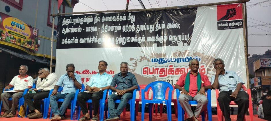 எமது மக்கள் அதிகாரம் அமைப்பு கடந்த டிசம்பர் 17 அன்று திருப்பரங்குன்றம் நில அளவை கல் மீது ஆர்எஸ்எஸ் – பாஜக நீதிமன்றம் இயற்ற துடிப்பது தீபமல்ல! மக்களின் வளர்ச்சிக்கும் மத ஒற்றுமைக்கும் வைக்கும் நெருப்பு!! என்ற தலைப்பில் மதுரை ஒத்தக்கடையில் பொதுக்கூட்டம் நடத்த திட்டமிட்டிருந்தது.