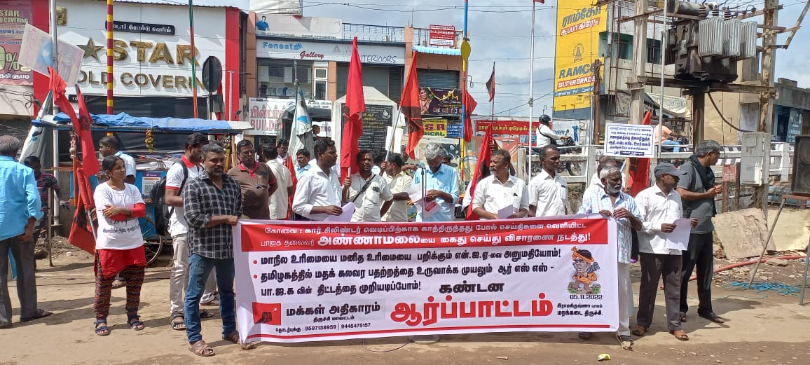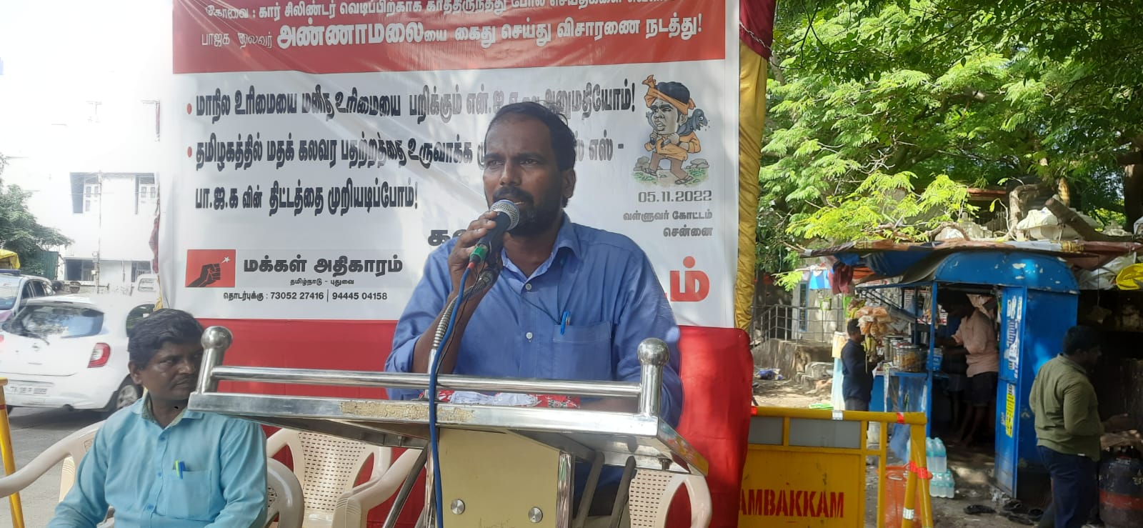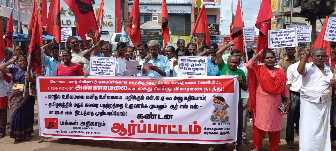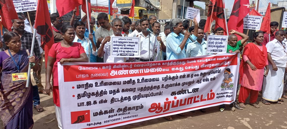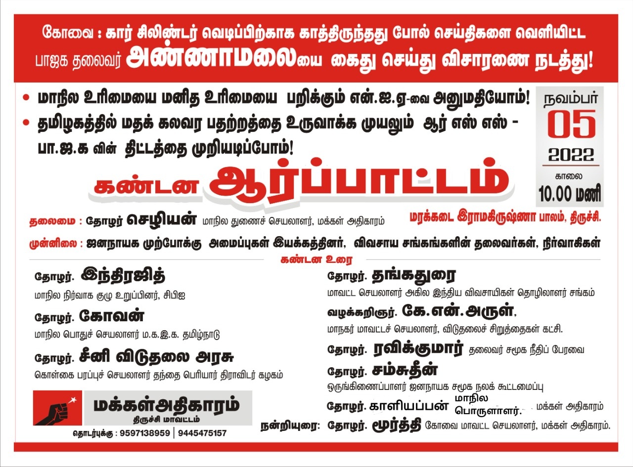 என்கிற முழக்கத்தின் அடிப்படையில் மக்கள் அதிகாரம் தலைமையில் சென்னை மாநகரத்திலும், திருச்சி மரக்கடையிலும் கண்டனம் ஆர்ப்பாட்டம் நடைப்பெற்றது. இதில் மக்கள் அதிகாரம் தோழர்களும், தோழமை அமைப்பைச் சார்ந்த தோழர்களும் கண்டன உரையாற்றினார்கள்.