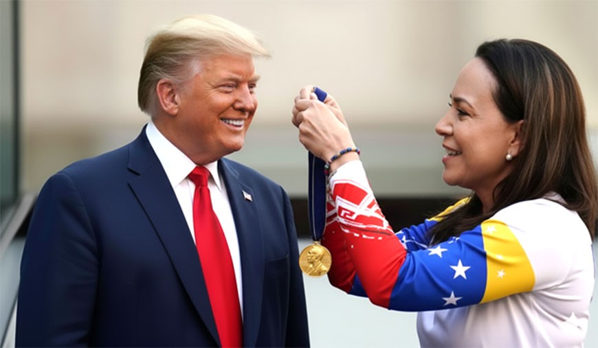 தென் அமெரிக்கா கண்டத்து நாடுகளில் ஒன்றான வெனிசுலாவில் ஏற்கனவே ஆட்சி புரிந்து வந்த ஹியூகோ சாவேஸ் அரசியலில் இருந்த காலத்திலிருந்து தற்போது வரை அங்கு நிலவிவரும், ‘சொல்லிக் கொள்ளப்படும் சோசலிச’ அரசுக்கு எதிராக ஆட்சிக் கவிப்பு திட்டத்துடன் செயல்பட்டு வரும் மரியா கொரீனாவுக்கு இந்த ஆண்டு சமாதானத்திற்கான நோபல் பரிசு வழங்கப்பட்டுள்ளது.
