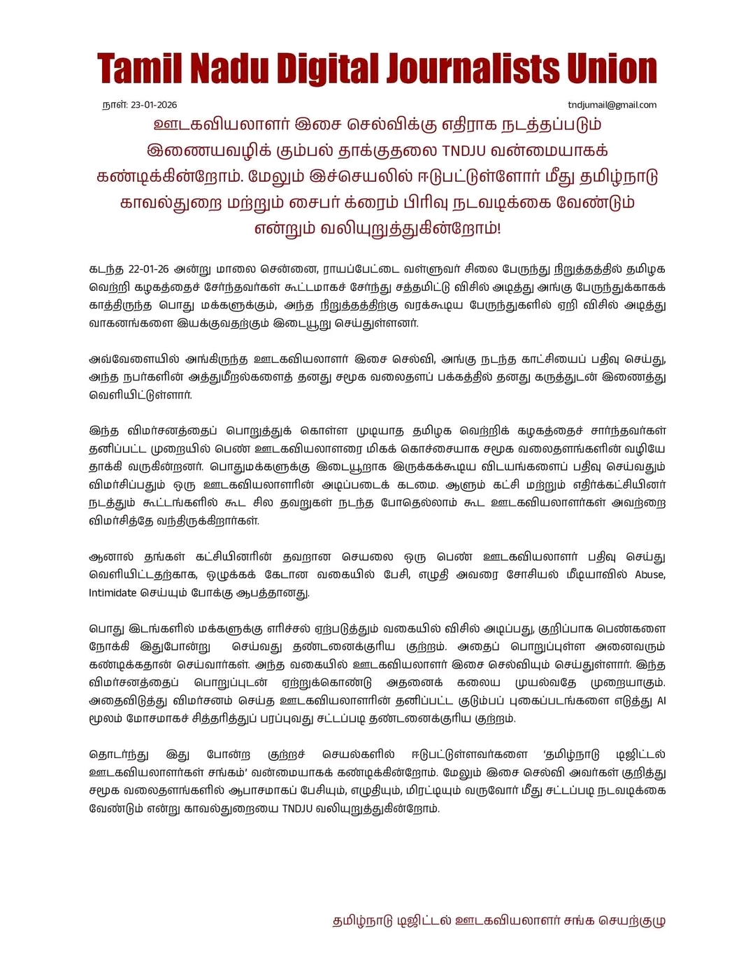 தொடர்ந்து இது போன்ற குற்றச் செயல்களில் ஈடுபட்டுள்ளவர்களை ‘தமிழ்நாடு டிஜிட்டல் ஊடகவியலாளர்கள் சங்கம்’ வன்மையாகக் கண்டிக்கின்றோம். மேலும் இசை செல்வி அவர்கள் குறித்து சமூக வலைதளங்களில் ஆபாசமாகப் பேசியும், எழுதியும், மிரட்டியும் வருவோர் மீது சட்டப்படி நடவடிக்கை வேண்டும் என்று காவல்துறையை TNDJU வலியுறுத்துகின்றோம்.